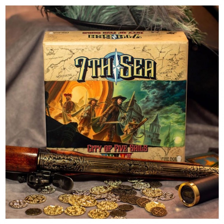 7th Sea: City of Five Sails is an expandable card game set in the swashbuckling world of the 7th Sea roleplaying game. Players control one of five factions as they fight to influence, control, and explore the independent and unruly city of Five Sails. It is typically played with two players, but multiplayer variants will allow more players to get into the game. During the game, each player represents a leader who, along with their allies, explores locations and fight both with swords and with wits for overall influence over the city. Along with each player’s individual deck, 7th Sea: City of Five Sails also includes an element of randomness in the form of a separate, shared deck that represents the city itself with unusual characters, items, and events that change the focus of the game. Combat is resolved in a unique “back and forth” style reminiscent of cinematic swordplay.