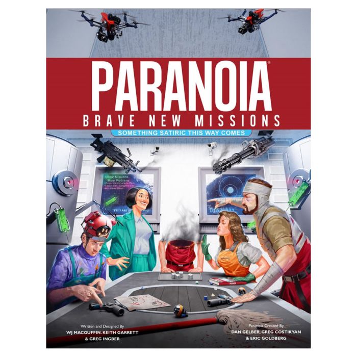 You wanna play Paranoia? Congratulations! You are superior to other gamers and have great taste. You even look sharp. Yet to play Paranoia, you need missions that torture present vibrant challenges so players can kill cooperate with each other’s Troubleshooters. Oh, and maybe succeed at the mission. Where can you find several missions gathered together so you can run Paranoia until people are laughing too hard to breathe? Yep, that is this book. See? You are superior simply by reading this. In this hot little book, Paranoia GMs can find five missions, ready to go, including… Certifiable: Your Troubleshooters already took and passed the Troubleshooter Certification Exam, right? RIGHT?? In the Clouds: Virtual Troubleshooters going after decidedly not-virtual treason. Think Tron with a higher body count. Meet ‘n’ Greet: People should not fear Troubleshooters, so it is time to force the public into liking them, or else. That will work! Stealth Train Redux: One of the best missions of all time is back! How can you protect a train that does not exist? Or maybe it does? Viva VEG Sector: Free Enterprise opens a casino with all the tropes and sarcasm you would expect. An albino tiger may or may not be involved. Five missions. One book. And more catch-22s than you can shake a depleted laser pistol at. Welcome to Brave New Missions: Something Satiric This Way Comes. Oh, and players can buy this book, but must not read it or you will ruin the fun!